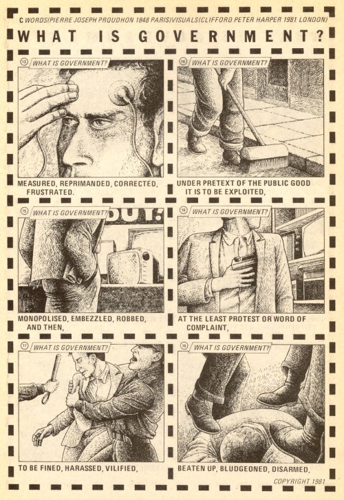 “What Is Government?” – From “What Is Government?” by Clifford Peter Harper, a visual adaptation of text by Pierre Joseph Proudhon. Published in Anarchy Comics #3, July 1981, Last Gasp Comics. –> https://biblioklept.org/2026/01/25/sunday-comix-37/